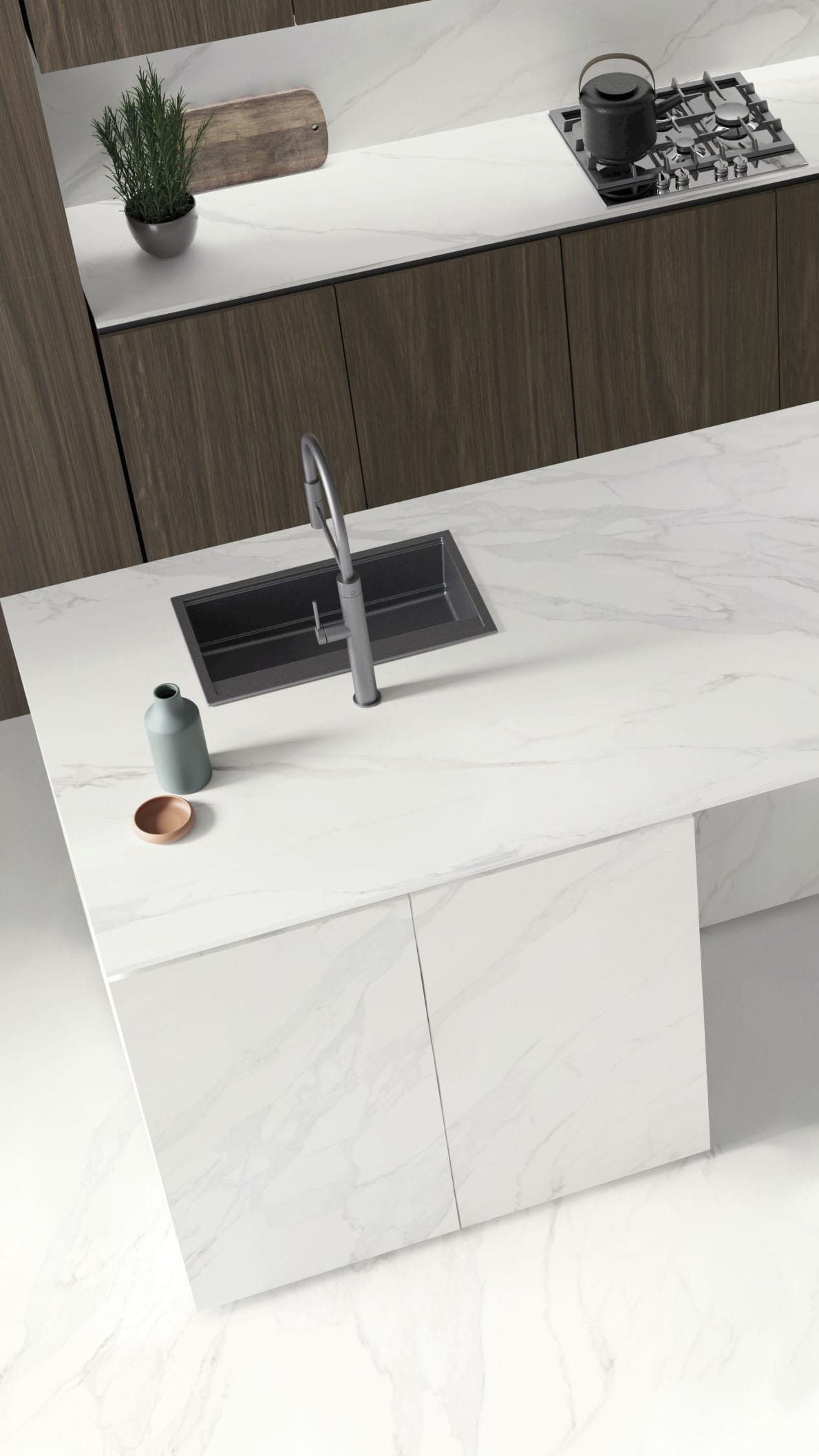 Statuario Imperiale Light porselen tezgah, mermer görünümlü şık tasarımıyla mutfak, banyo, zemin ve duvarlarda dayanıklı ve hijyenik çözümler sunar.